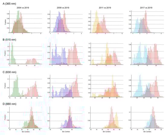 Pixel histogram of aged seeds vs non-aged seeds (CK). (A), 365 nm; (B), 515 nm; (C), 630 nm; and (D), 880 nm. Note: The X-axis of the histogram represents the type of pixels; The Y-axis represents the total number of pixels in each pixel type for each color. Green bars represent seeds harvested in 2004; dark blue bars for seeds harvested in 2008; yellow bars for seeds harvested in 2011; light blue bars for seeds harvested in 2017; and red bars for seeds harvested in 2019.