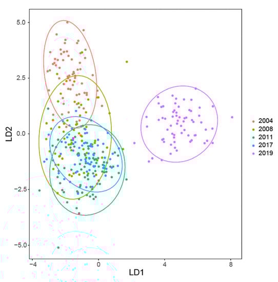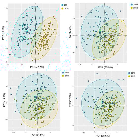 Five multivariate analysis models were developed based on the multispectral data. Firstly, the PCA results based on morphological and spectral features showed that the first two principles components explained 57.8% (2004 vs. 2019), 53.2% (2008 vs. 2019), 51.0% (2011 vs. 2019), 55.8% (2017 vs. 2019) of the original variance. The seeds of 2004 showed the best separation results, and the seeds of 2017 and 2019 could not be distinguished from each other (Figure 4). It is difficult to completely distinguish aged seeds from non-aged seeds by PCA. In contrast, SVM model in classifying aged seeds and non-aged seeds had an average accuracy value as high as 99.3% (2004 vs. 2019), 91.3% (2008 vs. 2019), 90.9% (2011 vs. 2019) and 87.4% (2017 vs. 2019), respectively. The sensitivity and specificity in SVM were also great, with a range from 87.6% to 99.6%, and from 87.3% to 99.0%, respectively. The average accuracy values of RF model in classifying aged seeds and non-aged seeds were 99.3% (2004 vs. 2019), 89.6% (2008 vs. 2019), 85.5% (2011 vs. 2019) and 84.6% (2017 vs. 2019). It was noticed that LDA model exhibited accuracy values as high as 99.8%~100.0%, the best sensitivity with a range from 99.7% to 100.0% and the best specificity of 100% in all the groups (Table 2).