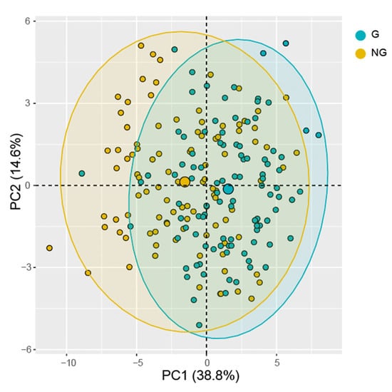 Furthermore, we tested the performance of multispectral data in predicting seed germination. The five groups of seeds harvested in 2004, 2008, 2011, 2017 and 2019 were divided into two categories: germinating seeds (G) and non-germinating seeds (NG) (Supplementary Figure S6), used for building the discriminant analysis models. The PCA results based on morphological and spectral features showed that the first two principles components explained 62.7% of the original variance (Figure 6). The average accuracy values of SVM and RF model in predicting germinated seeds and non-germinated were 72.0% and 69.7%, respectively. Notably, LDA is also the best model for distinguishing germinated seeds, with high average values of accuracy (97.6%), sensitivity (96.5%) and specificity (98.7%) (Table 2). The top eight important contribution features are all spectral data, such as Band9 and Band11 in LDA, and the morphological features were found in the top eight in SVM and RF (Supplementary Figure S7).