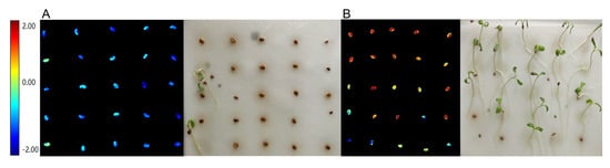 nCDA image vs. actual germination in aged seeds. (A), Seeds harvested in 2004 in the nCDA image (left) corresponded to their actual germination situation after ten-day imbibition (right). (B), seeds harvested in 2011 in the nCDA image (left) corresponded to their actual germination situation after ten-day imbibition (right). The blue seeds in the nCDA image failed to germinate.