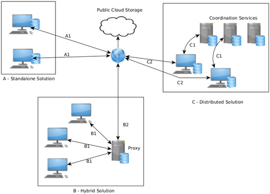 Figure 1 demonstrates the three main types of data manipulation: standalone, hybrid, and distributed. The following subsection will overview each of them, identify advantages and disadvantages, and overview the existing implementations.