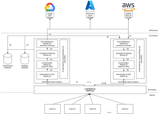 In our architecture, the user needs to be authenticated with the on-premise server to upload a file and communicating via HTTPS; otherwise, the connection is refused by the Authentication and SGX module (1). When the user uploads a file, Figure 2 is left, the content is analyzed according to the file type and active RAPS. If personal data are detected, it splits the information according to the anonymization algorithm that applies to the received file type. Depending on the file type, automatic personal data detection may not detect all the personal data on the file. To cope with this, we allow the user to send the file together with a list of portions of the file content that contain personal information. The anonymization uses that information to redact the personal data from the received file, storing the private information on the private cloud (2). After an anonymization process, two files are generated: one stored on the private cloud, containing the personal data, and the other stored on the public cloud, containing the remaining data. Data must be encrypted and split (3) before uploading it to the different public cloud providers configured (4). A hash is generated for the split data chunks used to verify the integrity of the data on the download process. The hash, the encryption keys, and additional file metadata are stored in an index, allowing the on-premise server to know which files are stored and how to retrieve them. The upload process can be seen as a sequential process that starts in U1 up to the storage in U5. Contrarily to the upload of a file, the download is more complicated. It consists of the same processes, but the order is different. First, the user is authenticated in the system (D1), then the information is collected from the cloud-of-clouds and private storage (D2), then the file recovers the original format and is checked against the HMAC (D3), and finally, the final step is the analysis of the personal identifiers (D4) to recreate the final file to return to the client (D5).