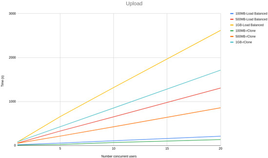 In the architecture section, we stated that our architecture is built to be scalable. We achieved this by allowing multiple machines to run the same on-premise server code behind a load balancer. The load balancer allowed us to split the load equally among all the available machines running the on-premise server. In our implementation, we used HAProxy [46] as our load balancing technology with a round-robin configuration, meaning that the number of requests are divided equally among all the machines running the on-premise server. To verify whether our solution is indeed scalable, we devised a test where we have 1, 5, 10, and 20 concurrent users uploading files of 100 MB, 500 MB, and 1 GB, running ten times for each number of concurrent users and file size configuration. To simulate a more realistic use case, we used Google GCP as our storage backends. In our testing, we used three on-premise server instances running locally on the same machine where the requests were made. To help us compare our solution scalability with other state-of-the-art cloud offload technologies, we compared our solution with rClone. rClone is a standalone solution, meaning that it should have no scalability issues, as it connects directly with the cloud storage without any additional processing made locally. That rClone properties will help us to understand the maximum capacity that our testing environment has and to have a baseline on which to compare our solution. We did not use Charon on this test since it uses a caching service, making it only upload a file at a time instead of continuously uploading all the files, making it impractical for this performance comparison.