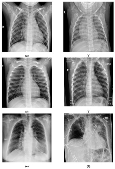 Samples of chest X-ray images assessed via Kaggle database [30,31,32] for training purposes: (a–c) normal chest X-rays; (d–f) COVID-19 chest X-rays.