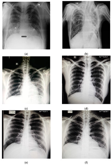 Samples of local Pakistani verified dataset used for the testing of trained models: (a–c) COVID-19 chest X-rays; (d–f) normal chest X-rays.