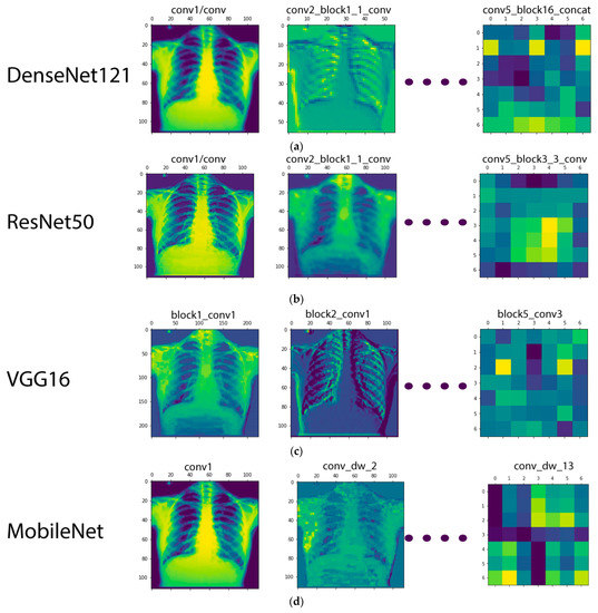 Visualization of the feature maps for the CNN models used in this study: (a) DenseNet-121; (b) ResNet-50; (c) VGG16; (d) MobileNet.