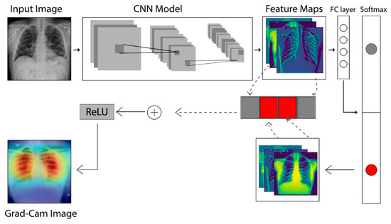 In CNNs, the gradient class activation map (Grad-CAM) is a technique that is used to create a class-specific heatmap. This generated class-specific heatmap is based on a specific input image using a trained CNN model [35]. The Grad-CAM technique is employed to figure out the COVID-19 detection transparency. This technique actually highlights the regions of the input image, which is where the model pays much attention during the classification process, implying the fact that the feature maps generated in the final convolution layer hold the spatial information that helps in capturing the visual pattern. This visual pattern contributes in distinguishing assigned classes. The Grad-CAM technique is applied by utilizing the layers and extracted features of the trained model. The architecture explaining the Grad-CAM technique is shown in Figure 8.