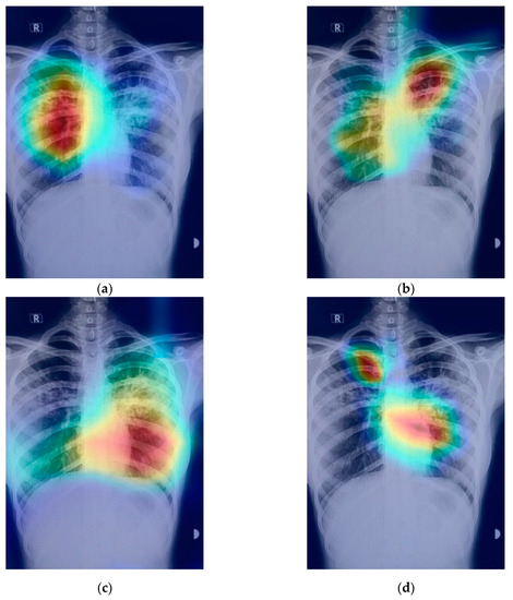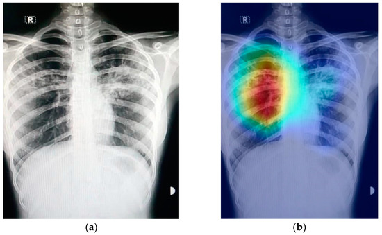 Figure 9 shows an example of a chest X-ray image generated using the Grad-CAM technique. The original chest X-ray image is shown in Figure 9a, whereas the overlay heatmap on the input image is shown in Figure 9b. The jet color scheme is used in this study. In this color scheme, blue tones represent lower values, which means that no features are extracted for a specific class, whereas the yellow and green tones represent medium values depicting quite less feature extraction, and the red and dark red tones represent larger values, i.e., the features in the region represent the specific class.