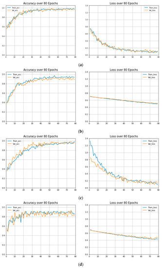 Training accuracies vs. validation accuracies and training loss vs. validation loss: (a) MobileNet; (b) ResNet-50; (c) DenseNet; (d) VGG16.