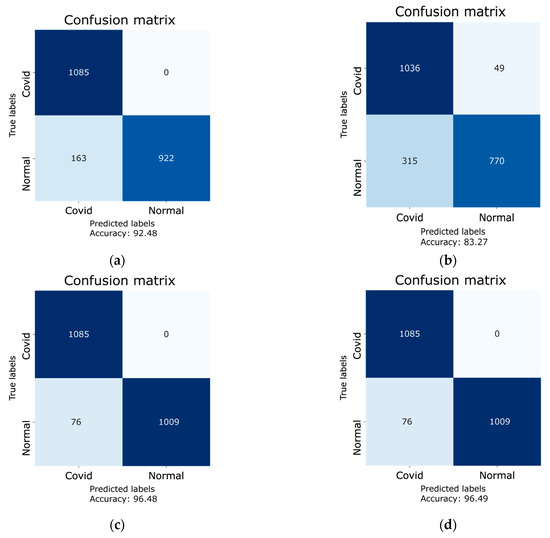 Furthermore, confusion matrices for all four models were generated in order to quantify the performance metrics, i.e., precision, F1-score, recall, specificity, and accuracy. The results of the aforementioned parameters are given in Table 5. The confusion matrices were generated using the testing dataset of 2170 images. These images were not included in the training and validation datasets. The confusion matrices of each model is given in Figure 11, whereas the true labels and predicted labels from confusion matrices with accuracies and 95% confidence intervals (CI) are presented in Table 6. In addition to calculating the confidence intervals, the Cohen’s kappa coefficient was also calculated for each model, which confirms the reliability of the implemented models. The DenseNet-121 has an accuracy of 96.49% (2094/2170), with a 95% confidence interval of [0.96, 0.97], and the computed Cohen’s kappa coefficient for Dense-Net-121 is 0.92. The ResNet-50 has an accuracy of 92.48% (2007/2170), with a 95% confidence interval of [0.91, 0.94], and the computed Cohen’s kappa coefficient for Res-Net-50 is 0.85. The VGG16, on the other hand, has an accuracy of 83.27% (1806/2170), with a 95% confidence interval and Cohen’s kappa coefficient of [0.82, 0.85] and 0.66, respectively. Besides, the MobileNet model has an accuracy of 96.48% (2094/2170), with a 95% confidence interval of [0.96, 0.97] and a Cohen’s kappa coefficient of 0.92. The result of the Cohen’s kappa coefficient lying in a range of 0.61–0.80 is considered to be a substantial agreement with the presented results, whereas the range of 0.81–1.00 is considered as an almost perfect agreement with the presented results [37,38]. It is evident from the aforementioned results that the Cohen’s kappa coefficients of the three retrained models, i.e., DenseNet-121, Resnet-50, and MobileNet, lie in the range of 0.81–1.00, and that the Cohen’s kappa coefficient of the VGG16 model lies in the range of 0.61–0.80. This confirms the reliability of the implemented models.