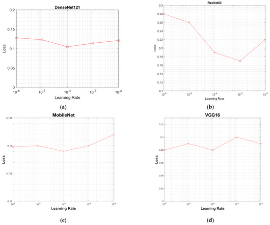 In order to choose an optimum learning rate for all models, the models were evaluated over a selected range of learning rates, i.e., from 10−2 to 10−6 (0.01, 0.001, 0.0001, 0.00001, 0.000001). The value of the testing loss was calculated for each model using the testing dataset of 2170 images (dataset details have been provided in Section 2.1 and Table 1). A value of the learning rate at the minimum loss was considered best for a model. The graphs between learning rates and values of the testing loss are given in Figure 12. In Figure 12a, the DenseNet-121 has the minimum testing loss of 0.1 at the learning rate of 0.0001. ResNet-50 has the minimum testing loss of 0.15 at 0.01, as shown in Figure 12b. MobileNet has the minimum testing loss of 0.129 at a 0.0001 learning rate, as shown in Figure 12c, and VGG16 has the minimum testing loss of 0.08 at a 0.0001 learning rate, as well as the same testing loss at a 0.00001 learning rate, as shown in Figure 12d. A learning rate of 0.0001 was chosen based on these results.