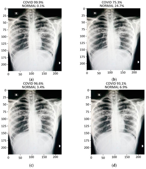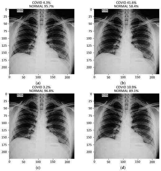 Results of prediction on a verified local Pakistani COVID-19 chest X-ray: (a) DenseNet-121; (b) VGG16; (c) MobileNet; (d) ResNet-50.