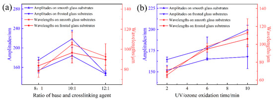 The relationships of wavelengths and amplitudes along with the (a) ratio of base and crosslinking agent and (b) UV/ozone oxidation time on the smooth glass substrates and frosted glass substrates, respectively.