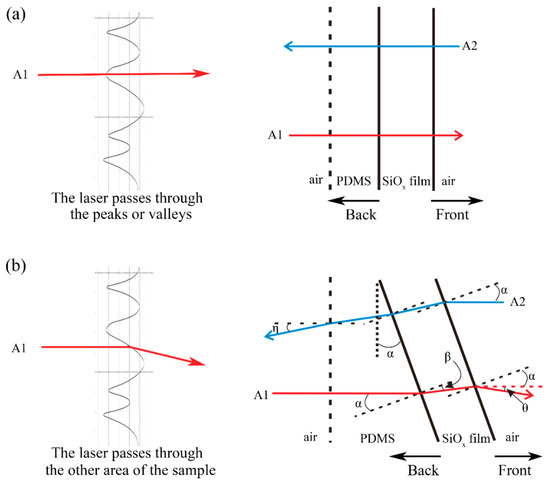 The cross-sectional profile of the microlens self-wrinkle structures could be approximately fitted to a sinusoidal structure (Figure 4b). We have also demonstrated the similar cross-sectional profiles of different areas of the self-wrinkle structure sample in Supplementary Materials Figure S3. When the laser passes through a certain position of the sinusoidal structure, the curvature radius of the SiOx film tends toward infinity at this position in geometric optics. Figure 5a shows that the laser direction does not change when the laser passes through the peaks or valleys of the sinusoidal structure. Here, the interface between the SiOx film and air is defined as the front, and the interface between the PDMS layer and SiOx film is defined as the back. When the laser passes through another area of the sample, the laser direction will be refracted. As shown in Figure 5b, a horizontal light, A1, irradiates the diffuser from the back side. The angle (α) is defined as the angle between the horizontal incident laser and the normal position. The angle between the vertical direction and the back SiOx film is also equal to α. The first refraction of the laser occurs at the PDMS-SiOx film interface and refracts again at the SiOx film-air interface. When the light transmits from the front side, the incident laser, A2, is refracted three times. β is the angle defined in Figure 5b. The final deflection angle (θ) between the second emitted light and the horizontal direction determined the diffusion ability of the optical diffuser. According to Snell’s Law, the refraction angle could be calculated as , and , for the first and second refractions, respectively, where n0 = 1 is the refractive index of air. As a result, , where the deflection angle θ is independent of ns.