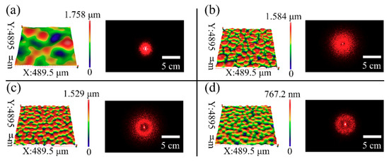 The diffusion ability of the typical samples 2, 7, 8, and 9 were evaluated, as shown in Figure 6. The aspect ratios (R = A/Λ) of the microlens self-wrinkles structures for samples 2, 7, 8 and 9 are 1.78 × 10−3, 5.06 × 10−3, 4.59 × 10−3, and 1.95 × 10−3, respectively. The visual shift of the diffused spot is very clear, which can be observed by the naked eye. The diffused spot on the screen becomes noticeably large with the increase in the self-wrinkle aspect ratio. This phenomenon agrees with prior reports in the literature [12,14], which showed that a larger aspect ratio (R) resulted in broad diffused spots. In addition, the light intensity is greater at the center of the diffuse spot and a hollow ring appears in the center of the diffuse spot in Figure 6b–d, which are caused by the peaks or valleys of the sinusoidal structure (shown in Figure 5a) and the excessive deflection angle θ (shown in Figure 5b), respectively.