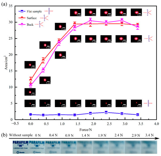 (a) The relationships between the spot area and applied force when the laser irradiates a flat sample, and wrinkle structures samples from the front side and back side, respectively. (b) Transmitted images of the PARAFILM logo through the sample with different forces.