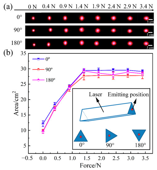 As shown in Figure 7a, the laser spot gradually increases with the uniaxial tensile strain for the self-wrinkle sample. The diffusion spot area increases when the applied force increases from 0 N to 1.4 N (including plate weight). The strain changes the morphology of the self-wrinkle structures, so the aspect ratio changes accordingly. The incident angle (α) in geometric optics increases isotropically with the force. It may be the main diffusion reason of the strain-dependent optical diffuser. It shows that the shape of the diffusion spot gradually turns to elliptical with a force over 1.4 N. At this stage, the microlens arrays gradually turn into ellipsoids due to the uniaxial stretching strain, thus resulting in the transformation of a circular spot to an elliptical. Additionally, the diffusion spot area is kept constant and is a strain-dependent anisotropic diffusion. It shows similar results when the laser irradiates the diffuser from the front and the back of the sample, as shown in Figure 6a. The diffuser is probably independent of the direction of the laser incidence. The above results show that the optical diffusion is reversibly tuned by adjusting the magnitude of the applied force.