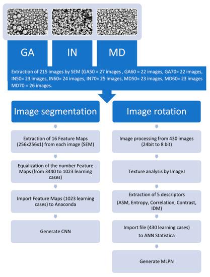 In view of the above, more and more endeavors are being made to find methods that support food preservation, which are aimed at lengthening the durability of food [5]. One of the popular methods of food processing is spray drying. This technique started to be developed by Samuel Percy in the 1870s [6]. Currently, the above method is used in food products in the form of solutions and suspensions—for example, juices and juice concentrates, for instance strawberry juice concentrates [7], milk [8], and honey [9]. It is worth noting down that also an innovative way of spray drying was used in the paper, which differs from traditional solutions. It should also be added that one of the methods of artificial intelligence in the form of artificial neural networks (ANN), whose functioning is based on using appropriate mathematical or programming formulas, was used in the paper [10,11,12]. Artificial neural networks are most commonly used in terms of data, which do not have simple and organized structure calculations. ANN are used above all in stochastic issues, and the ones related to information processing, among other things, with images (bitmap) [10], acoustic emission [13], and numerical data [14,15]. The networks were also used in the process of deep learning, which includes extended methods of image processing. One should not forget that Convolutional Neural Networks (CNN) [10,16] are enjoying more and more popularity. CNN allows prediction [17,18], classification [19], analysis, data association, signal filtering, and process optimization [20,21] in a much shorter time. In the context of deep learning, special attention should be paid to the package called TensorFlow. It is a set of functions enabling the creation of neural networks in a relatively simple and clear way. It allows carrying out operations on tensors, whose modifications constitute the basis for the functioning of artificial neural networks. Another package based, among other things, on the TensorFlow module is the package called Keras. Keras offers solutions that substantially shorten records of artificial neural network in the form of source code. Functions and methods of the Keras package allow preparing input data for a neural network, for example such as image conversion to tensor or the other way round, in an efficient way [13]. In the research, electron microscopy was carried out (SEM) [22], which is currently gaining popularity in terms of recognizing the morphological structure of food. The authors noticed that the morphological structure of fruit powder particles allows an efficient evaluation of their quality [4,7,12,23]. Determining texture parameters was based on a well-known matrix of co-occurrence of gray bands (GLCM) isolated from scanning images [7,24,25,26]. It should be added that also infrared spectroscopy, which is a fast and non-invasive method providing high effectiveness of identifying food products, is attracting more and more interest [27]. It was found that this method turned out to be more effective than the existing solutions up to date [28]. It is proven by a wide range of physiochemical markers for fruit powders. Those analyses are expensive and time-consuming, which eliminates them from application during the controlling process. In the research, evaluation of the effectiveness for Convolution Neural Network, Multi-Layer Perceptron Network, and FTIR was carried out in the process of identifying nine research trials of raspberry powders on the basis of the degree of saccharification and the type of polysaccharide. The utilitarian aim of the research was to create neural models capable of identifying fruit powders obtained in the process of low-temperature spray drying in a quick and non-invasive way [29]. Innovative solutions were based on image technique SEM (having an indirect effect on texture and image pixel) and on spectrum in absorbance function (FTIR).