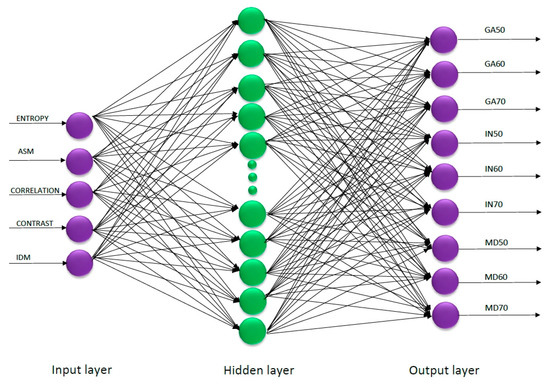 In order to determine adequate neural networks before the network training process, the minimal and maximum number of hidden layers was determined. For the minimal number of hidden layers in the neural model, the authors determined 10 layers, and the maximum number of hidden layers included 25 layers. It was noticed that for the training set used in the research characterized by a low number of hidden layers, neural networks obtained low classification efficiency. In case of exceeding 25 hidden layers, the networks had a tendency to overtrain, resulting in output with high error [38]. Among the networks that achieved high classification effectiveness with low RMSE were the networks that contained neurons in the hidden layer with activation function: logistic, tanh, exponential, and sigmoidal. The process of training with neurons in the hidden layer with the linear activation function obtained the highest RMSE. A simulation of networks was made, from which an adequate neural model was selected and saved. The selected neutral model was the one with the highest classification capabilities, which was created from 5 neurons in the input layer, 24 neurons in the hidden layer, and 9 neurons in the output layer (Figure 2). The MLP network was obtained with the activation function Logistic (for the hidden layers) and Softmax (for the output layer). The effectiveness of MLPN 5:5-24-9:1 on account of classification accuracy reached 0.962, while the RMSE value was at the level of 0.029 for the training, testing, and validation sets (Table 2). As part of the previous research with a digital camera and scanning microscope, the structure of microparticles in strawberry fruit powders was determined on the basis of parameters such as color, RGB, shape, and texture [7]. The MLP 30:30-19-4:1 network achieved a high classification effectiveness at the level of 0.99 and RMSE at the level of 0.03 with parameters related to each other such as color, RGB, and selected parameters of texture with 1960 training cases [7]. In the current research, an attempt was made to evaluate image texture with the structure of microparticles from a microscopic image. It was observed that in relation to the current research, the obtained MLP 5:5-24-9:1 (Figure 2), for which five texture descriptors were determined, was much more efficient in the classification of samples of fruit powders with a lower number of training cases (430 training cases).