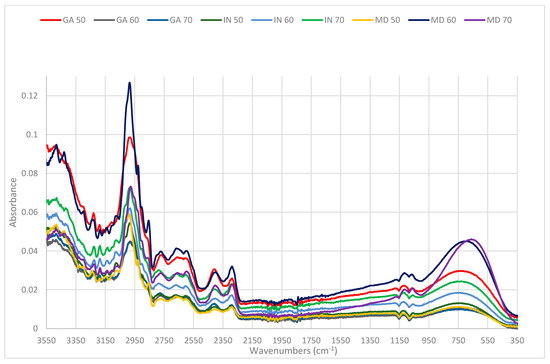 Analyzing the first spectral ranges of wave numbers from 2500 to 3550 cm−1 shows a wide asymmetric bond caused by valence vibrations of hydroxyl groups of bonds expanding the OH engaged in hydrogen bonds and expanding the vibration C-H. In this area, there occurs a sharp band with the wave number 2950 cm−1, which is assigned to the valance vibration of C-H asymmetric stretching of CH2 [42]. The highest intensity of this band can be observed for the trial with a 60% raspberry content and with a 40% maltodextrin carrier and for the trial with a 50% raspberry content and a 50% gum arabic carrier.