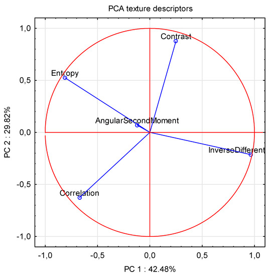 In the final stage Principal Component Analysis (PCA) was carried out. Data acquired from the learning set were pictured (texture descriptors). Figure 4 and Table 5 show that the entropy variables strongly and negatively correlated (R2 = −0.89) with the IDM variables. PCA analysis showed that the lowest correlation between texture descriptors occurred with the ASM variable.