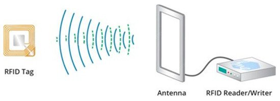 - The RFID reader is responsible for identifying the tag. It consists of a transmitter, a receiver, a microprocessor, and an antenna that sends an electromagnetic wave carrying a signal towards the element to be identified. In return, it receives the signals containing the information from the tags. The reader can be fixed or mobile, and its antenna can take several forms [35].