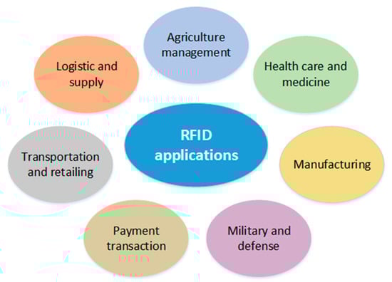For example, in manufacturing, RFID systems that can resist extreme environmental conditions can be practical for controlling and monitoring operations and thus increase the efficiency of the manufacturing process [39,40,41]. RFID can be used to track the movement and health of animals [42]. In agriculture, it allows manual health tracking of all identified animals, automatically and without much expenditure [43,44]. More precisely, it helps to ensure that every animal on the farm is eating the right food.