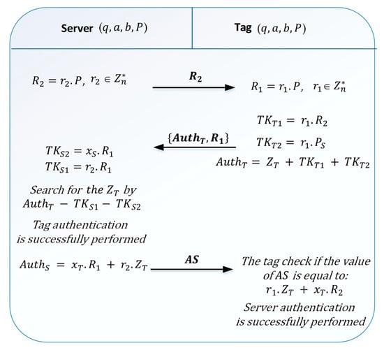 - Zheng, L.; Xue, Y.; Zhang, L.; Zhang, R. Mutual Authentication Protocol for RFID Based on ECC. In Proceedings of the 2017 IEEE International Conference on Computational Science and Engineering (CSE) and IEEE International Conference on Embedded and Ubiquitous Computing (EUC), Guangzhou, China, 21–24 July 2017. [Google Scholar]