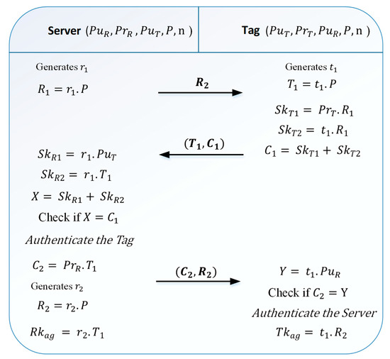 The advantage of ECC-based RFID authentication protocols is the prevention of any kind of secret key sharing between the tag and the server. Thanks to the ECC primitives, the secret keys are transmitted in an encrypted form. This encryption method is protected by the discrete logarithm problem (DLP) principle. In addition to RFID authentication protocols, the literature shows other types of wireless communication protocols, such as the key agreement protocols. These protocols rely on the principle of secret key sharing in such a way that this key will be known by one or more entities [6]. Among the most famous key agreement protocols are those based on chaotic maps and user-defined protocols [7,8].