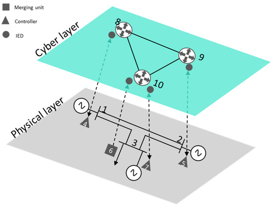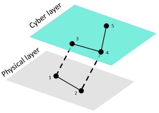 Figure 4 gives the cyber-physical structure corresponding to the three-bus network illustrated in Figure 2a. In this case, set is composed of ten nodes, seven corresponding to the OT layer (and three corresponding to the IT layer . The supra-adjacency matrix has 10 × 10 dimensions, where the , and (27) matrices correspond with the adjacency matrices of the extended physical layer, the cyber layer, and the connection between them, respectively.