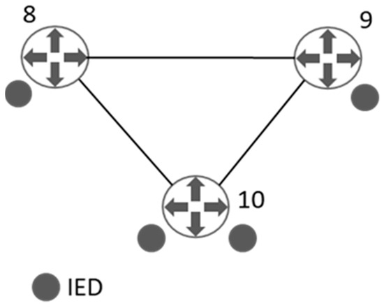 Figure 3 shows the communications graph corresponding to the ICT infrastructure of the smart grid displayed in Figure 2. In this case, set is composed of three nodes () corresponding to the three routers (labelled from 8 to 10). The three routers collect information provided by the IEDs, MUs, and controllers installed in the electrical infrastructure.