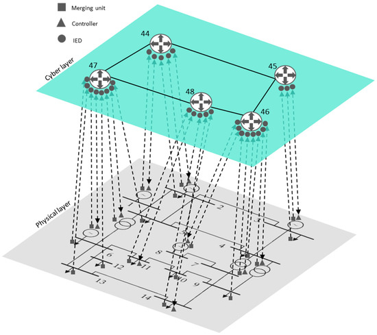 Using multilayer network theory, the cyber-physical model has been applied to the IEEE 14-bus test case network [30], which includes the communications infrastructure (Figure 5). The multilayer cyber-physical model consists of the electrical network layer (the grey layer in Figure 5), the communications network layer (the green layer in Figure 5) and the OT-IT interconnections between the two layers (dashed lines in Figure 5).
