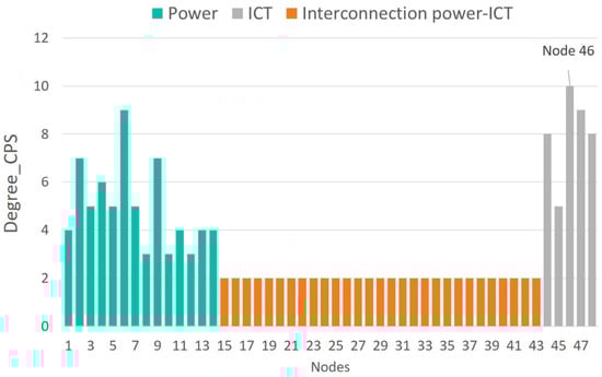 - Holistic model of the cyber-physical network: if the smart grid is considered as a CPS (nodes 1–48), it is observed that the most vulnerable nodes correspond to routers located at nodes 46 and 47. An attack that places nodes 46 and 47 out of service results in the loss of information and communication with OT nodes 4, 7, 8, and 9 and 5, 6, 10, and 11, respectively. Table 4 demonstrates that according to the node degree index in the CPS model, nodes 46 and 47 are two and five times more vulnerable compared to node 4 (in the traditional OT model) and the IT nodes, respectively. Moreover, the CPS model’s betweenness index determines that the router at node 47 has 303 critical links compared to 25 critical connections for node 4 and 1 connection for the IT nodes. Considering the betweenness index, it can be deduced that the loss of node 47 affects more than twelve times the critical connections of node 4. These results indicate that the cyber-physical network model as a whole, proposed in this paper, is the only model that allows us to identify the most vulnerable nodes in the smart grid as a single entity. Moreover, it enables us to determine the scope of a cyberattack upon routers 46 and 47 (IT) and the resulting implications for the OT layer.