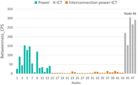 - Multilayer centrality indices allow the detection of vulnerabilities in the smart grid as a single CPS. According to the degree index, the vulnerability of the critical node in the CPS is twice as high as the vulnerability detected using traditional methods. Regarding the betweenness index, the vulnerability of the router located at node 46 is twelve times higher than the vulnerability of the primary substation located at node 4.