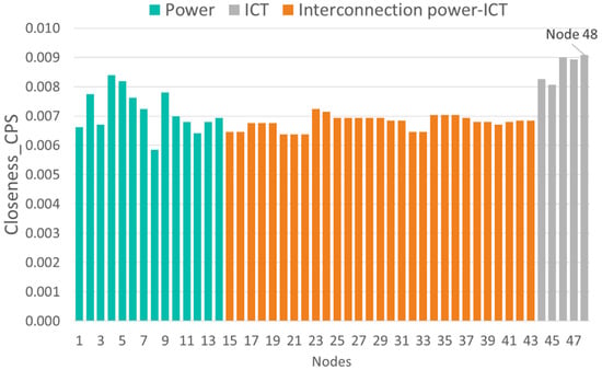 - Traditional IT network model [21]: when performing the vulnerability assessment [21] on the communication network (nodes 44–48), all the nodes present the same vulnerability level, indicating that there are no critical routers that could affect the vulnerability of the IT network.