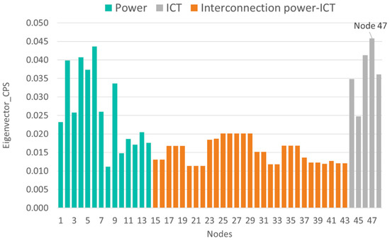 Figure 6, Figure 7, Figure 8 and Figure 9 show the vulnerability levels of each of the 48 elements in the CPS, which are determined using the following multilayer centrality indices: node degree, closeness, between-ness, and eigenvector. Elements of the OT layer are coloured in green, elements of the OT-IT bridge are highlighted in orange, and elements of the IT network are shaded in grey.