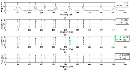 Figure 1 displays an example of the frequency detection results for signals including ten tonal frequency components at an SNR of 15 dB; the results are normalized by the corresponding maxima for the convenient comparison. Here, the built-in functions of rootmusic and esprit in MATLAB are used for RMUSIC and ESPRIT (Figure 1c,d), respectively, and their prerequisite condition of signal frequency component number is exactly determined in the simulation. The FFT merges the two frequency components in close proximity owing to its low resolution arising from the short signal length. While the advanced schemes of ESPRIT and RMUSIC demonstrate a better distinction of the close frequency components (frequency components around 50 Hz), they not only overlook some frequency components (frequency components around 125 Hz) but also divide a single frequency component into two (frequency component around 260 Hz). The problems are remarkably mitigated by the SBL, which reconstructs all of the signal components near the corresponding frequencies from the measurements. This is attributed to its sparse solution directly derived from the linear system and the multiple measurements which remain as consistent signal components while suppressing random noise components during the iterative process in the SBL. Meanwhile, the SBL estimations slightly deviate from the true values because the off-grid true frequency components are represented by their neighbor on-grid columns in the matrix of the linear system (basis mismatch) [18,25,26,27,28,29,30].