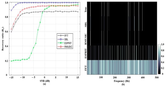 (a) The recovery ratios for FFT, SBL, ESPRIT, and RMUSIC according to the SNRs. Ten frequency components are included in each trial; (b) the detection results at the lowest SNR of −15 dB, which qualitatively displays the detected frequency components from the schemes.