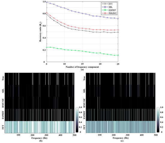 In this section, we present the frequency detection results using synthetic data, which allows performance analysis of the SBL according to various SNRs and frequency component numbers. For the comparison, we applied FFT, ESPRIT, and RMUSIC, which are the representative frequency analysis algorithms, along with the SBL. The frequency detection performance is compared in terms of the recovery ratio (), which is defined as the ratio of restored frequency component number to the total frequency component number (see Equation (23)).