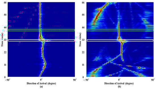 The pilot signal has a 10 dB to 45 dB higher amplitude than the others, and the weak signals are masked by the ocean ambient noise even when multiple measurements along time and space are used. Beamforming using the strongest signal (i.e., beamforming at the frequency corresponding to the pilot signal) indicates the track of the experimental ship (Figure 4a), which approaches the array from its broadside and gets further away after 33 min; the path is confirmed by the GPS of the experimental ship. During the measurements, several fishing boats are near the array and low-frequency tonal sounds from the boats are inevitably in the recording. In Figure 4b, broadband beamforming using some passive signal components from the fishing boats and the experimental ship (marked with black circles in Figure 5), which are identified by the SBL in the following subsection, display regular tracks including the experimental ship. Thus, in the current study, the tonal signals from the transducer and the ships are referred to as signals, which should be detected using frequency analysis algorithms.