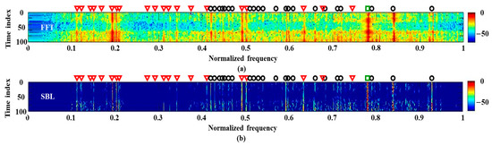 Figure 9 displays the averaged frequency detection results of Figure 8e,f. As seen in Figure 9a, some frequency components from the FFT provide vague detection results because they are hidden by their neighbor noise (in particular, estimations between 0.1 and 0.2). Additionally, a minor component around 0.8 is masked by the sidelobe of the near major component, which arises from the low resolution of FFT. The lost frequency components are recovered by the SBL owing to its sparse estimations with effective exploitation of the multiple measurements (Figure 9b). The recovery ratios of FFT and SBL are the same as 0.71, respectively. However, the number of perfectly matched components from SBL (28) is much larger than that of FFT (15). Thus, the SBL is better in detecting the frequency components owing to the higher resolution with fewer false alarms.