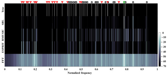 For the simulation in Figure 1, the FFT, RMUSIC, ESPRIT, and SBL require computational times of 0.0005 s, 0.1344 s, 0.0970 s, and 1.896 s, respectively, under the computational environment of Intel(R) Core (TM) i9-9900K CPU. Meanwhile, the modified CS of ANM recovers the frequency components from the linear system with a computational time of 544 s (not shown in the current study). Although the SBL has more computational complexity than the classical approaches because of solving the linear system directly, it is still useful in the frequency analysis owing to its ability to recover signal frequencies in high resolution and reduce false detections with moderate computational time (much less than that for CS).