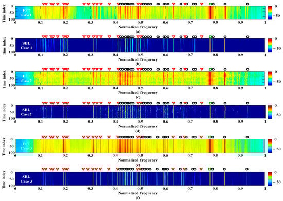 Subsequently, the acoustic data captured farther from the experimental ship (the green box around 41 min in Figure 4) are used for the frequency analysis. Here, the FFT and SBL are applied to the multiple measurements in time and space domains (case 1 and case 2), separately, and the detection results are shown in Figure 8. In particular, all the acoustic signals at the sensors in the HLA are used for the spatial multiple measurements (120 multiple measurements). The frequency detections from RMUSIC and ESPRIT are too sensitive for the prior condition of the frequency component number, and they are omitted from Figure 8.