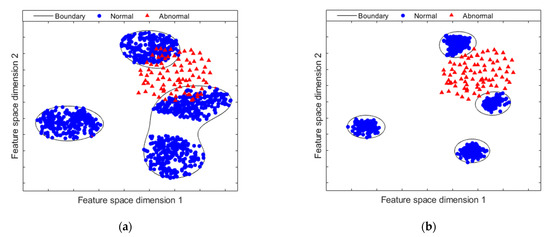 However, for real-world problems, regardless of their approach, there are other problem to be addressed: the distribution and behavior of the characterized patterns. It should be noted that, in industrial operation environments, the behavior of the patterns tends to have a sparse representation, that is, the distribution of the known class can be represented by more than one cluster within the features space. Taking into account that for the OCC-based approach to have a better result, the normal class distribution must be as compact as possible. The assumption that a compact feature space improves the performance of OCC classifiers is shown in Figure 1. In Figure 1a shows a feature space without a compact representation. In this case, the samples of the normal and abnormal class can overlap. As a consequence, the classification performance decreases in the presence of a large number of false negatives. Meanwhile, a more compact feature space is shown in Figure 1b. The clusters of the different distributions of the normal class are grouped together. Further-more, there is a wide margin of separation between normal samples and anomalous samples and therefore outside the classification boundary. This effect on performance improvement is also addressed in [36].