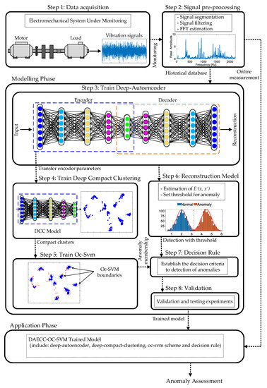 Inspired by the high capacity to pattern management through DL, in clustering-based algorithms and the anomaly detection abilities of OCC schemes, in this paper a novel method called the deep-autoencoder-compact-clustering one-class support-vector machine (DAECC-OC-SVM) is proposed for anomaly detection on electromechanical industrial systems. The main objective of this paper is to propose a methodological process to deal with the problems of DDCMs in industrial systems that are present in the current smart manufacturing environment. The contributions of this paper are summarized below: