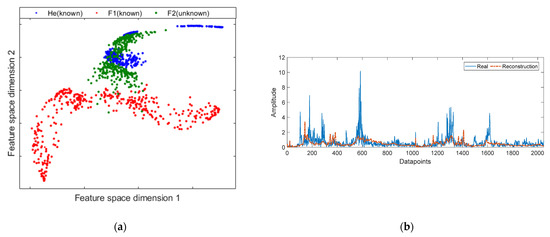 Characterization of known states (He and F1) and an unknown fault state (F2): (a) feature space mapping of the bottleneck obtained through a traditional DAE; (b) real signal of unknown fault status and its respective reconstruction by mean DAE.