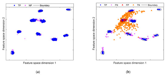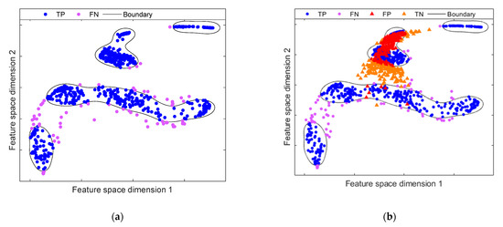 To address these shortcomings for anomaly detection, the DCC is introduced to improve the feature rendering resulting from the DAE’s bottleneck. The objective of DCC is to achieve a compact representation of the feature space mapping. As mentioned, a traditional DAE is not optimized to generate a compact representation of the data, producing overlap between normal and abnormal samples. This overlap hinders the performance of the classifier. As shown in Figure 7a, the boundary created through the OC-SVM scheme is too lengthy for normal data, due to the feature space is not dense. In this regard, when projecting the data of the anomalous samples in the mapped space, these will be placed within the boundary, producing high values of false negatives. This effect is shown in Figure 7b. A significant overlap can be noted between normal and abnormal samples mapped within the boundary generated by OC-SVM. In contrast, when the DCC introduces compactness in the representation and denser clusters are produced, the OC-SVM scheme generates close boundaries, as shown in Figure 8a. Consequently, there is a significant reduction in the overlapping areas between normal samples and abnormal samples, as seen in Figure 8b. Note that the representation of normal samples has been grouped into several very compact groups compared to the mapping provided by the traditional DAE. This is owing to the fact that centroids provide the distribution of the data, corresponding to the different operating conditions of the system.