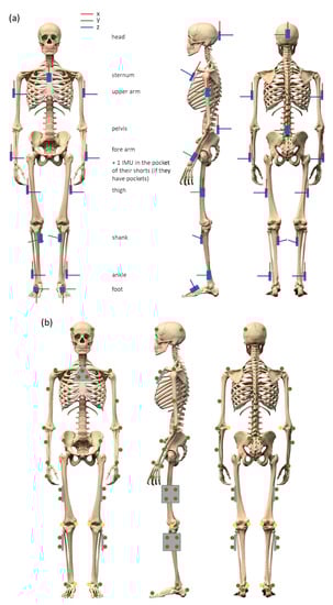 (a) Placement of inertial measurement units (IMUs) including the orientation. (b) Placement of the reflective markers measured by the optical motion capture system.