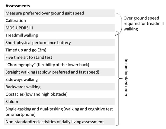 During the assessment of patients, there will always be a staff member standing close to the participant to support the patient in case of a loss of balance. Patients with PD will be asked to perform the whole protocol part twice, both on and off dopaminergic medication. An overview of the protocol is given in Figure 2.