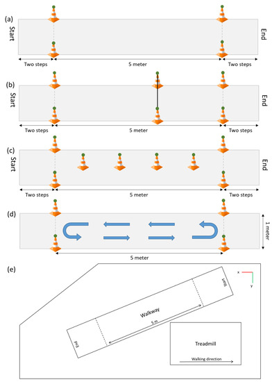 - Walking up and down the 5 m walkway for 30 s, turning direction was not instructed (“Please walk up and down the walkway at your normal speed and stay within the area marked by the cones”; Figure 3d)